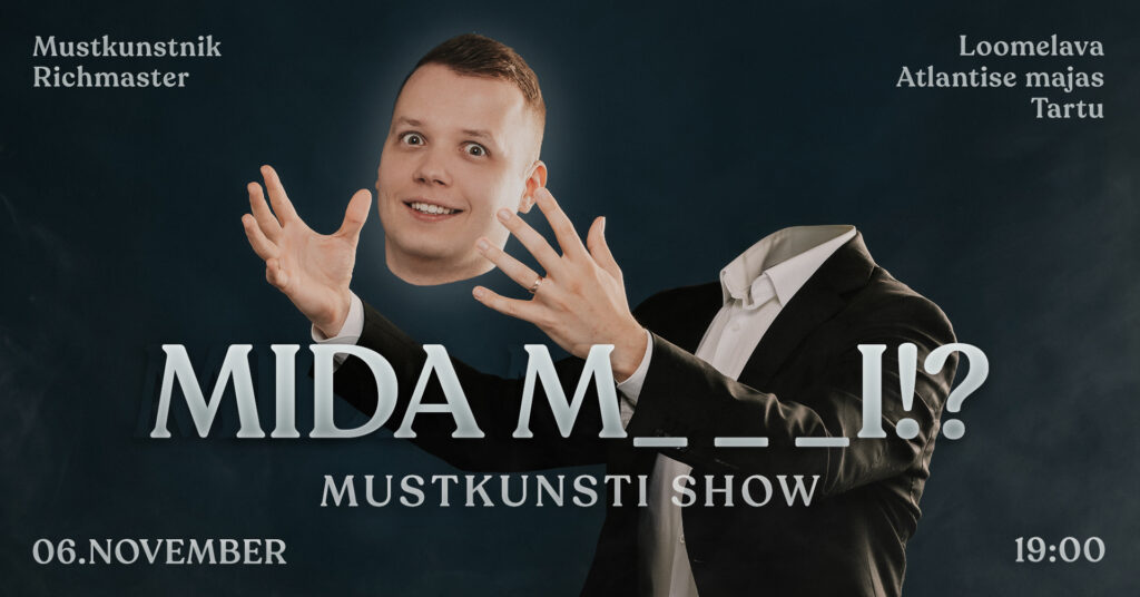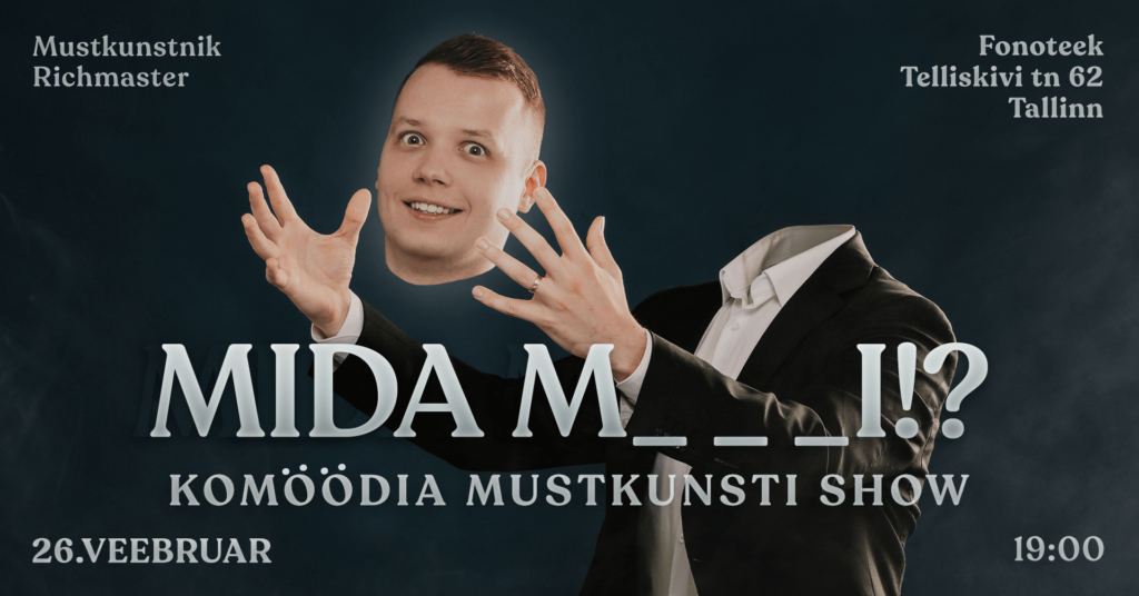 Kombineerides komöödia mustkunstiga, saan luua hämmastava ja humoorika elamuse kõigile kohalviibijatele. Etteaste on intiimne, täis naeru ja publiku osalemist. Garanteerin, et muudan Sinu ürituse osalejatele meeldejäävaks ja kui väga hästi läheb, siis laseb keegi ennast ka naerust täis.